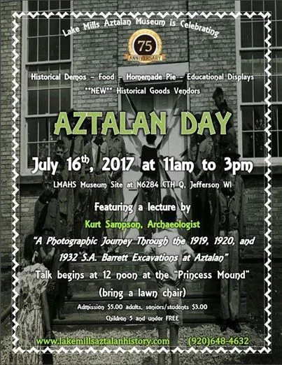 The main Lake Mills-Aztalan Historical Society Aztalan Day events will take place from 11:00 AM to 3:00 PM at the Lake Mills-Aztalan Historical Society grounds at the corner of Hwy Q and Hwy B. As part of the many activities there Friends of Aztalan State Park board member Kurt Sampson will give a noon presentation on early 20th century Milwaukee Public Museum excavations at Aztalan. This will take place at the “Princess Mound” located behind the old Church, now the Lake Mills-Aztalan Historical Society Museum.