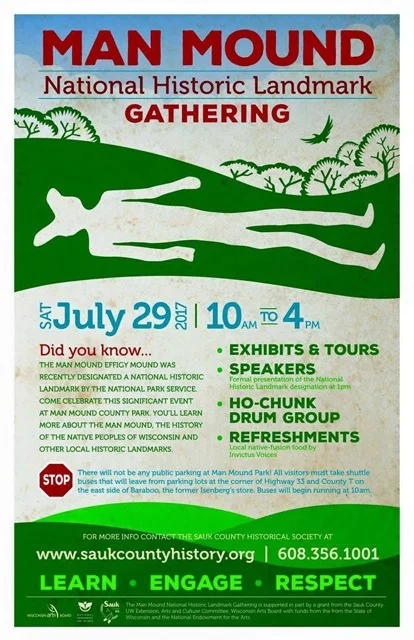 Man Mound National Historic Landmark Gathering Saturday, July 29, 2017 10:00 AM 4:00 PM 10:00 16:00 Google Calendar ICS Celebrate the recent designation of Man Mound as a National Historic Landmark in Baraboo, Wisconsin. Exhibits, tours and speakers will inform guests about the mound, the history of the Native peoples of Wisconsin, and other local historic landmarks.